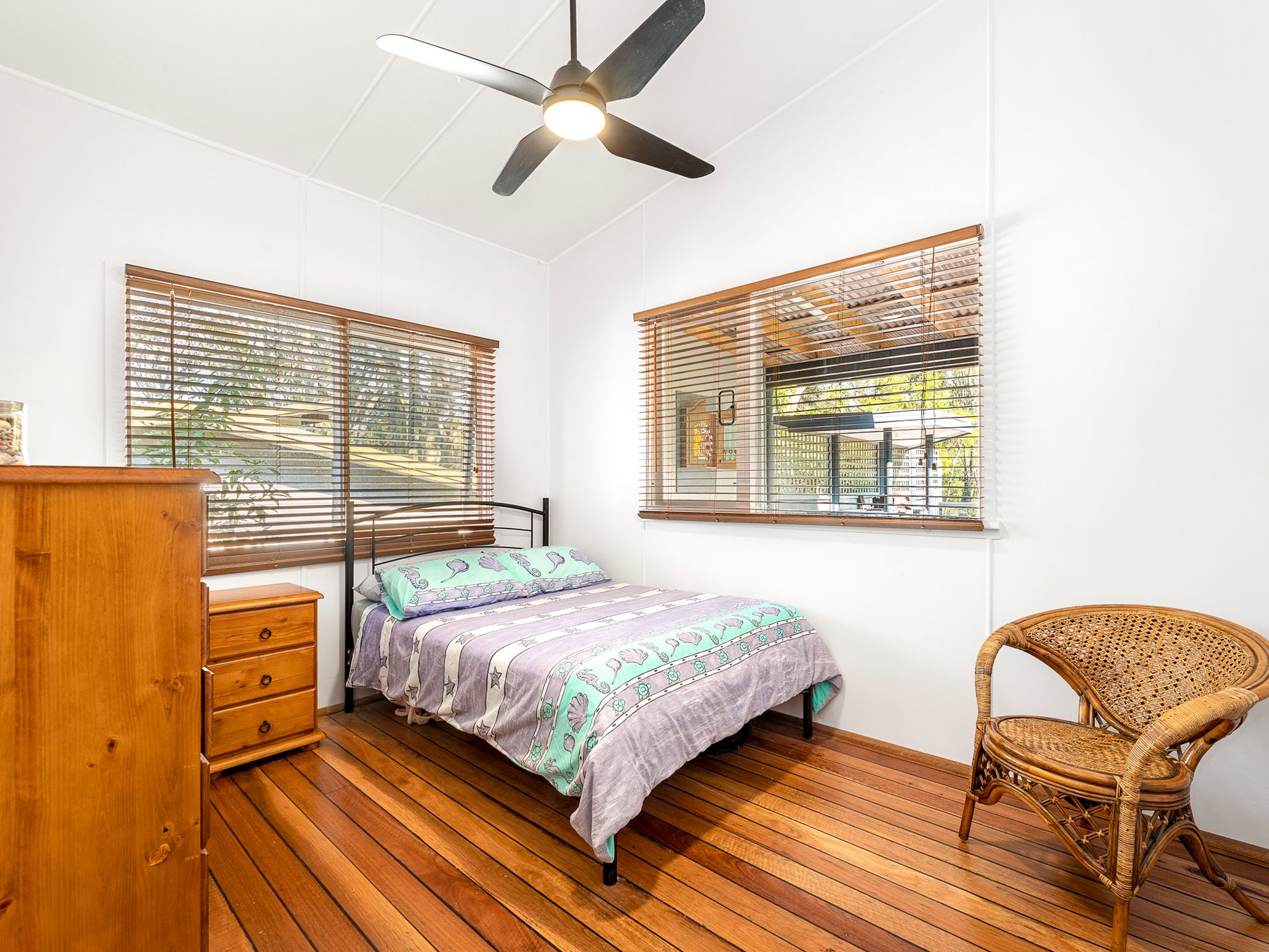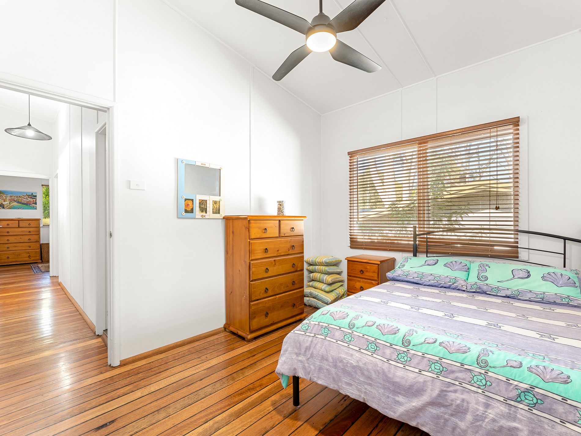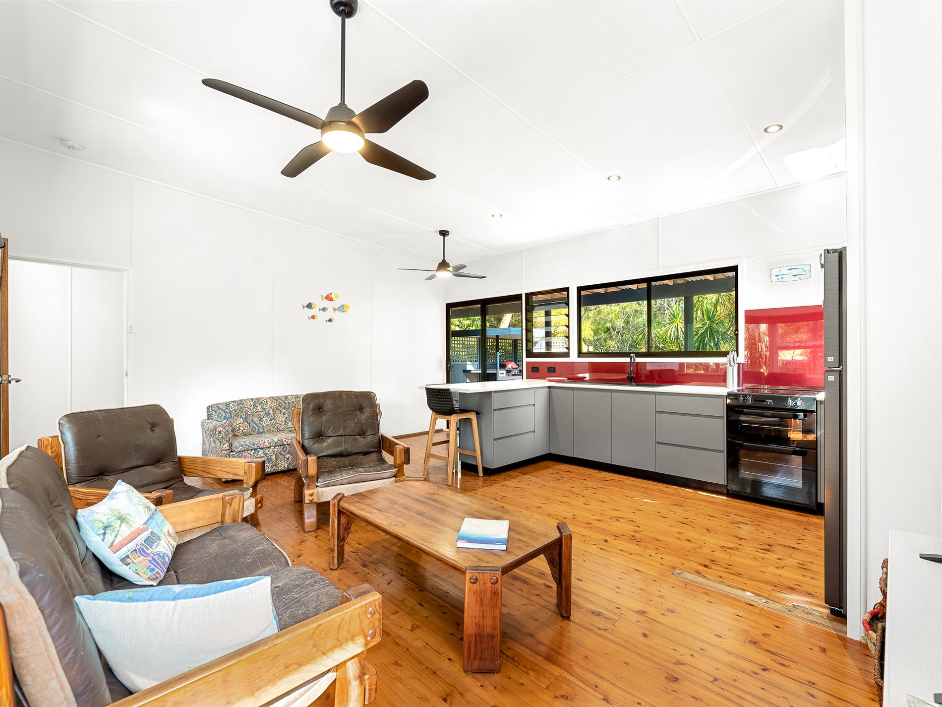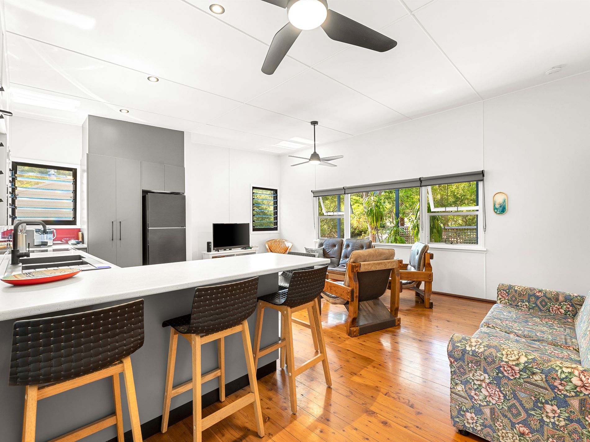 Inside, the home opens into a light filled, open plan layout where original timber floorboards showcase the home’s rich history while thoughtful modern updates create a practical space for year round living. Sunlight pours through comfort glass, illuminating the interiors and enhancing the relaxed atmosphere throughout.